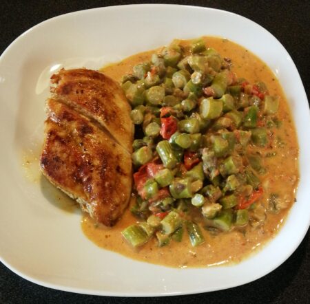 Den Spargel in Stücke schneiden. Zwiebel schälen und würfeln, zusammen mit dem Spargel anbraten. Die Gemüsebrühe zugeben und alles ein wenig einkochen lassen. Tomaten halbieren und ebenfalls dazu geben. In der Zwischenzeit das Hähnchenfilet klein schneiden und scharf anbraten, würzen nach Belieben. Nun das Hähnchenfilet zum Spargel geben und den Frischkäse unterrühren. Das Ganze kurz ziehen lassen.