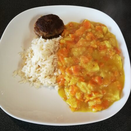 Mairübchen-Möhren-Ragout in Currysoße mit Bratwurst