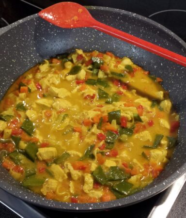 Möhren und Paprika kleinschneiden. Zwiebel würfeln und zusammen mit dem kleingeschnittenen Hähnchenbrustfilet in der Pfanne anbraten, rausnehmen und bei Seite stellen. Möhren, Paprika ins Bratfett geben und mit Curry würzen. Nun mit Kokosmilch auffüllen, Fleisch dazu und zugedeckt etwa 10 Minuten köcheln lassen (bis Gemüse bissfest ist). Zuckerschoten dazu geben und kurz mitgaren.
