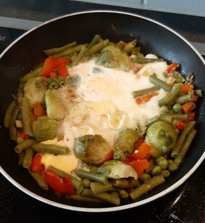Die Bohnen waschen und putzen, dann in mundgerechte Stücke schneiden und für 5 – 6 Minuten in einem Topf mit kochendem Wasser garen. Dann abgießen und im Sieb abtropfen lassen. Frischen Rosenkohl putzen, die welken Blätter entfernen und dann halbieren. Tiefgekühlten Rosenkohl auftauen lassen, halbieren. Frische Erbsen aus der Schote herauslösen, tiefgekühlte Erbsen auftauen lassen. Paprika halbieren und in mundgerechte Stücke schneiden. Die Schalotte schälen und fein würfeln.Olivenöl in der Pfanne erhitzen und Schalottenwürfel anschwitzen. Nun die Bohnen, Rosenkohl, Erbsen und Paprika dazugeben und alles rundum braten. Das Gemüse mit Salz und Pfeffer würzen. In der Pfanne mittig etwas Platz machen und dort die Eier hineingeben. Eier braten, nach Belieben die Pfanne mit einem Deckel verschließen, so werden die Eier auch an der Oberseite schneller gar. Spiegeleier würzen und alles heiß in der Pfanne servieren.