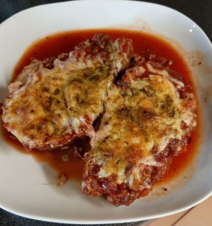 Die Auberginen der Länge nach durchschneiden und entkernen. Nun die ausgehöhlten Auberginen in einen großen Topf mit Wasser ca. 10 Minuten köcheln lassen, abgießen und in eine Auflaufform legen. In der Zwischenzeit die geschälte und in Würfeln geschnittene Zwiebel zusammen mit dem Hackfleisch in etwas Öl anbraten. Das ganze nun gut würzen und die passierten Tomaten zugießen. Kurz aufkochen lassen. Nun die Tomatenmasse in die Auberginenhälften füllen und mit Käse bestreuen. Bei 180° grad für 15 Minuten überbacken.
