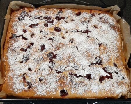 Die Eier mit Zucker schaumig rühren. Mit Backpulver vermischtes Mehl und Öl nach und nach in die geschlagene Eimasse unterheben. Man kann auch Vanillearoma hinzufügen. Den Teig auf dem gefetteten und bemehlten Backblech verteilen. Glatt streichen und die Oberseite mit Früchten belegen. Bei 170 °C ca. 30 Minuten backen – immer im Auge behalten. Nach dem Backen mit Puderzucker bestreuen.