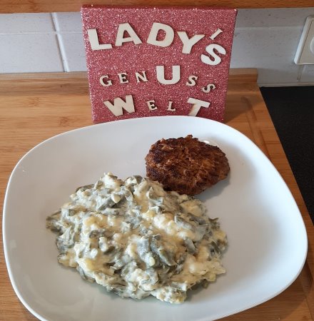 Die Schnibbelbohnen waschen und schräg in Streifen schneiden. In Brühe zusammen mit dem Bohnenkraut kochen bis sie gar sind. In der Zwischenzeit die Kartoffeln in Würfel schneiden und in Salzwasser gar kochen. Wenn die Kartoffeln gar sind mit einem Kartoffelstampfer grob zerstampfen. Salzen und pfeffern und den Becher Schmand unterrühren. Nun die abgeschütteten Bohnen unterrühren und eevntuell nachwürzen. Dazu passen Frikadellen oder auch frische Bratwurst