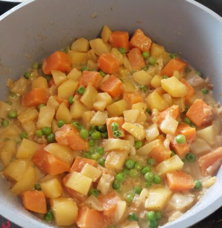 Alle Zutaten würfeln. Die Zwiebelwürfel in der Pfanne glasig anbraten. Nun die gewürfelten restliche Zutaten zugeben und alles schön anbraten. Gut würzen und mit Weißwein ablöschen. Anschließend die Brühe sowie die Erbsen zufügen.Zugedeckt etwa 15 Minuten köcheln lassen. Danach die Kochsahne unterrühren und eventuell noch einmal abschmecken.