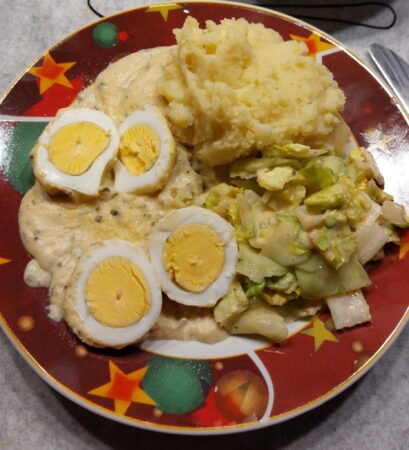 Die Eier ca. 10 Minuten kochen. Fett in einem Topf bei schwacher Hitze schmelzen, das Mehl darin anschwitzen. Mit Sahne und Milch ablöschen. Unter Rühren aufkochen, dann bei schwacher Hitze ca. 10 Minuten köcheln lassen. Das Eigelb verquirlen und unter die Soße rühren. Mit Salz, Pfeffer und Muskat kräftig abschmecken. Schnittlauch waschen, trockentupfen und in kleine Röllchen schneiden. Die Soße damit bestreuen. Eier abschrecken, schälen und halbieren. Mit der Schnittlauchsoße in einer flachen Schale anrichten und mit wenig Paprika bestreuen. Dazu schmecken ein gemischter Blattsalat und Kartoffelpüree.