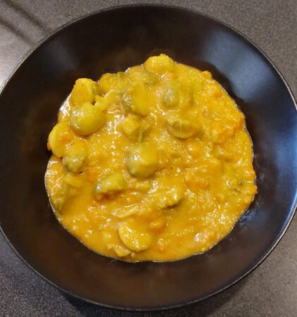 Knoblauch und Zwiebeln fein hacken. Den Rosenkohl putzen und halbieren. Die Süßkartoffel schälen und würfeln. In etwas Öl die Zwiebeln zusammen mit dem Knoblauch anbraten. Nun den Rosenkohl und die Süßkartoffeln zugeben und mitdündten. Das Gemüse mit Currypulver, Salz und Pffer würzen und die Gemüsebrühe sowie die Kokosmiclh zugeben. Gut verrühren und zugedeckt ewa 20 Minuten köcheln lassen, zwischendurch mal umrühren.