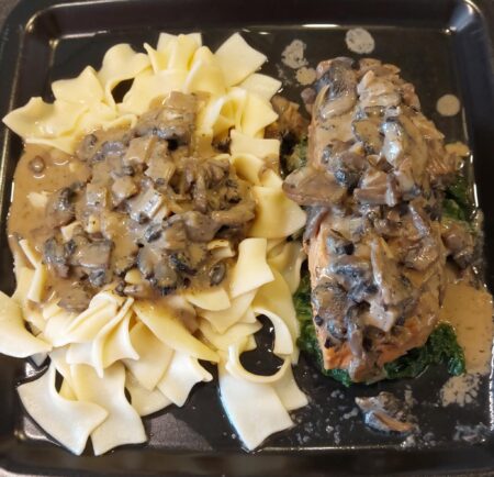 Den Lachs mit Salz und Pfeffer würzen, in Öl knusprig anbraten, herausnehmen. Die geschälten und gewürfelten Zwiebel, den Knoblauch und die Pilze in Butter anschwitzen, mit Brühe ablöschen. Sahne, Senf und Dill einrühren, würzen und kurz köcheln lassen. Nun den Spinat in Butter mit Knoblauch anschwitzen, gut würzen. Spinat auf Teller geben, Lachs darauflegen, mit Sauce übergießen.