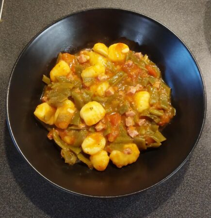đż Schnippelbohnen in Tomaten-KrĂ€uter-Sauce mit Schinken und Gnocchis